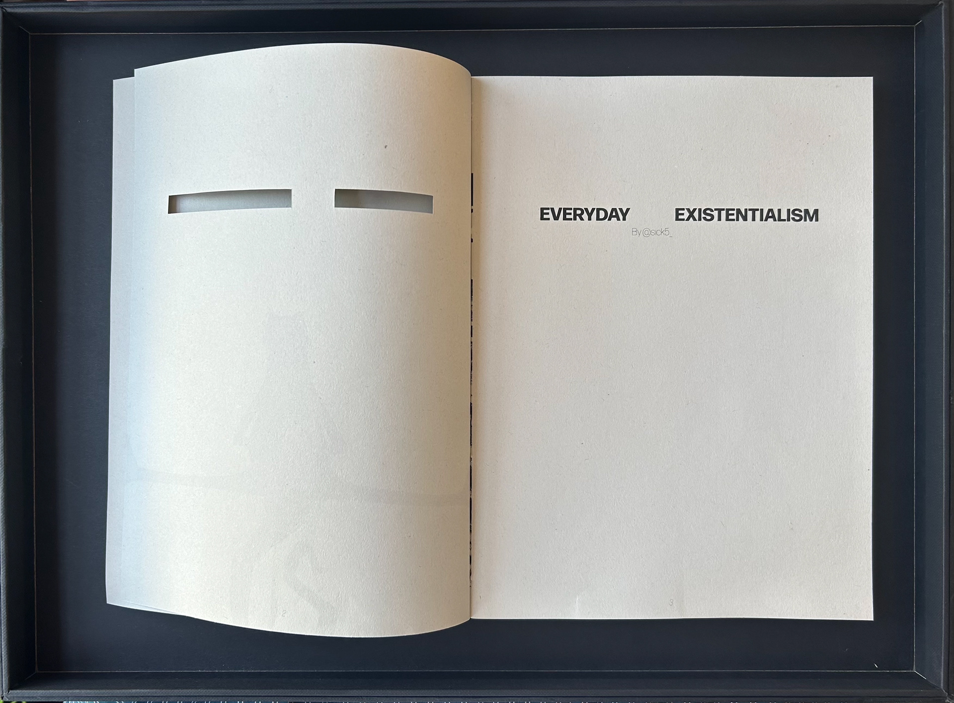 As the third expression of my project 'Everyday Existentialism' I designed and hand bound this book which looks into the methodology behind the project, celebrating the original source material as well as the final outcomes.